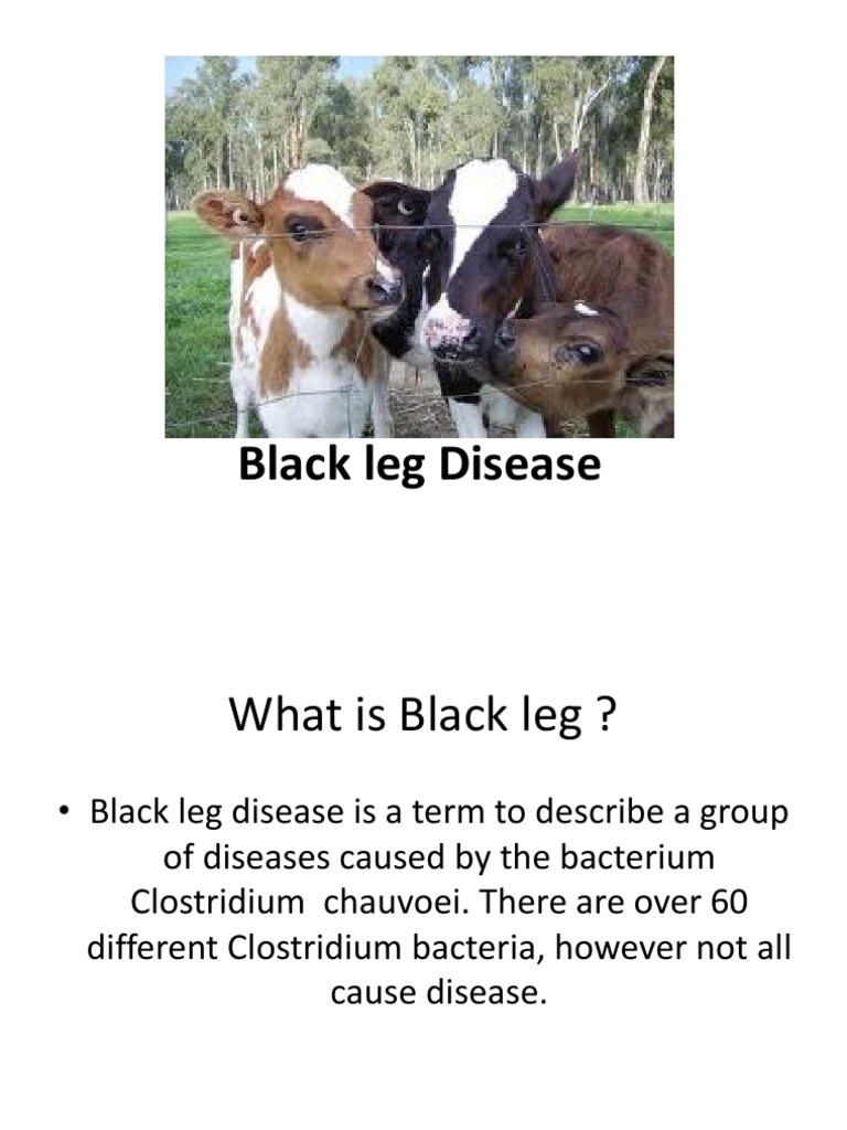 The bacteria enters the calf by ingestion and then gains entrance to the body through small punctures in the mucous membrane of the digestive. It is an acute infectious dis- ease that affects mainly young cattle and sometimes sheep. Blackleg is a fatal disease of young cattle.